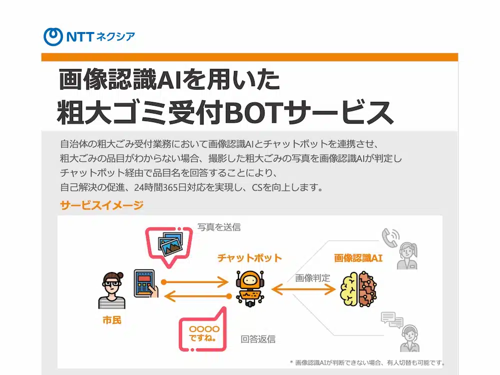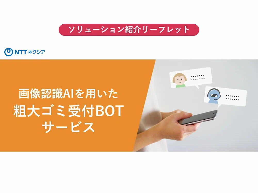 本資料では、粗大ごみの品目が分からない方の問い合わせ対応を自動化する、粗大ごみ受付業務における画像認識AIを用いた粗大ごみ受付BOTサービスについてご紹介します。
