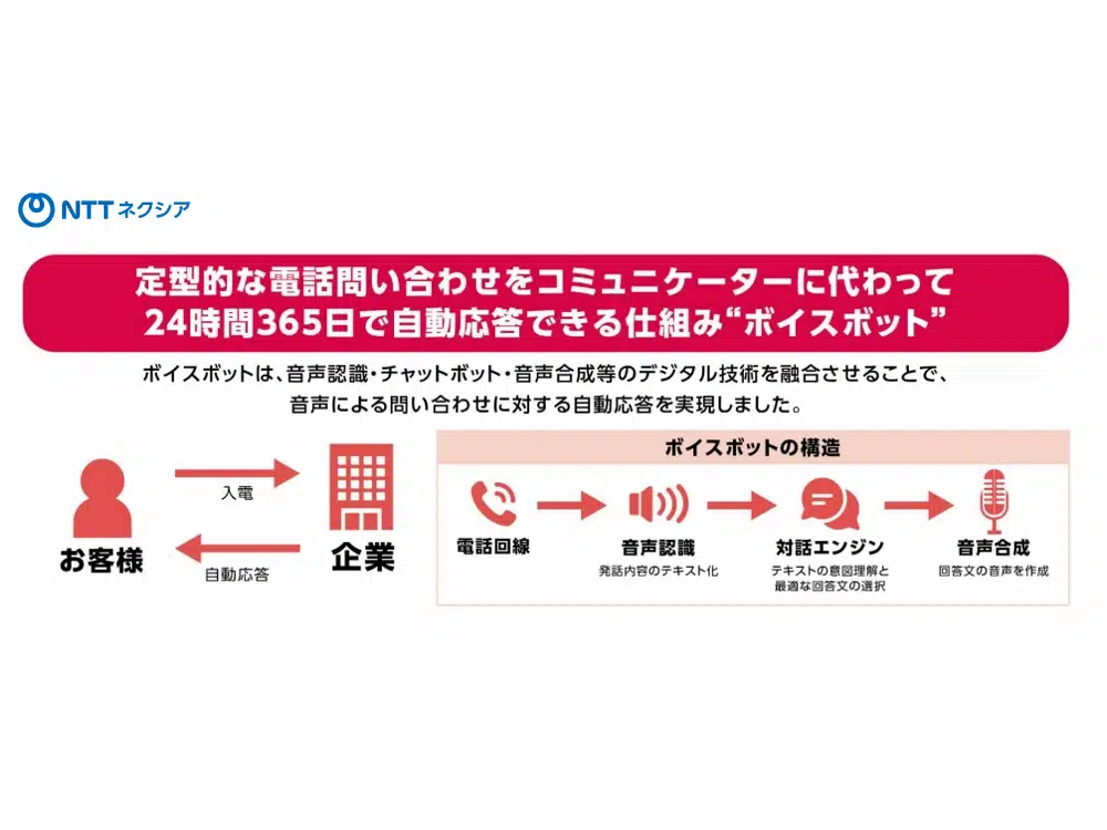 簡易な問い合わせから複雑・高度な問い合わせまで、人手を介さずにAIがコミュニケーターに代わって電話応対を行う「AI音声応答サービス(ボイスボット)」についてご紹介します。