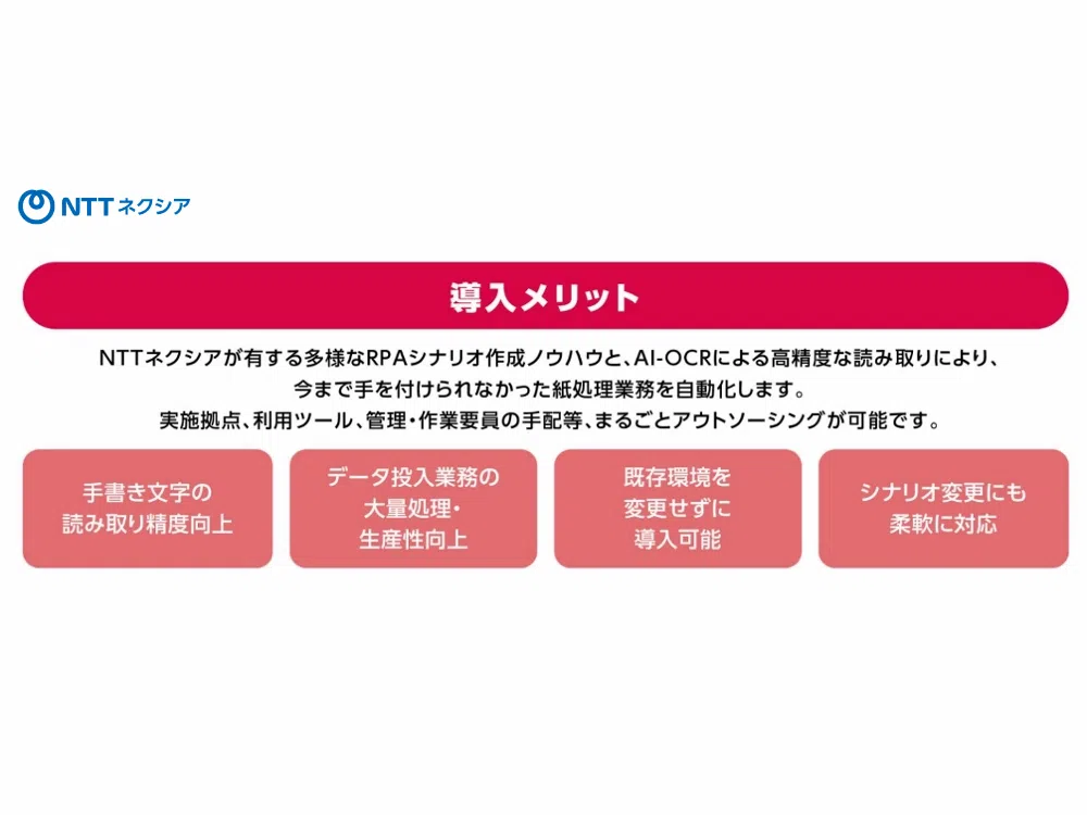 NTTネクシアでは、従来の紙作業の効率化をスキームに、NTTネクシアの強みであるセンター機能を活用することで、業務全体をアウトソーシングするソリューションを提供しています。