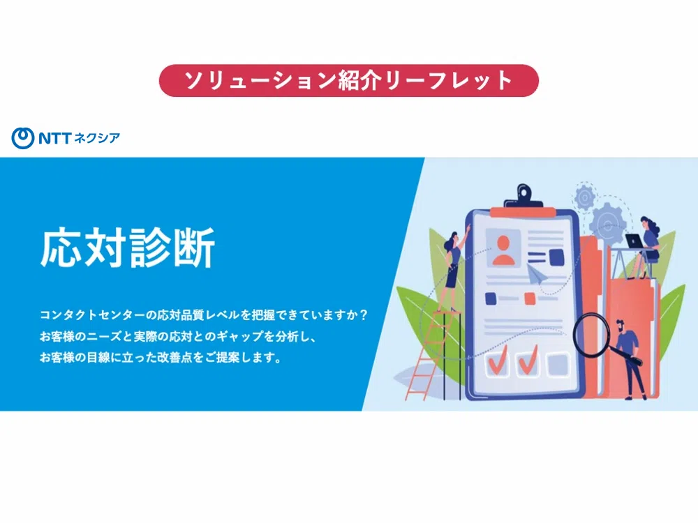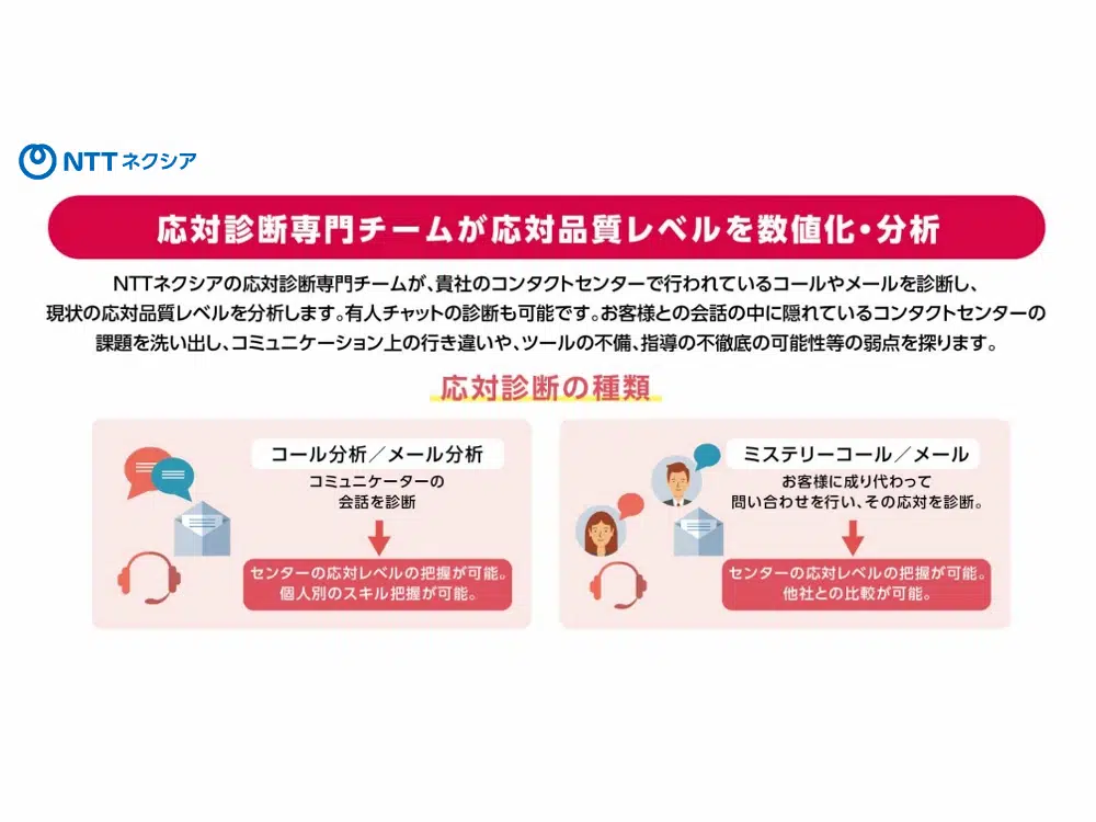 NTTネクシアの応対診断専門チームが、貴社のコンタクトセンターで行われているコールやメールを診断し、現状の応対品質レベルを分析します。有人チャットの診断も可能です。
