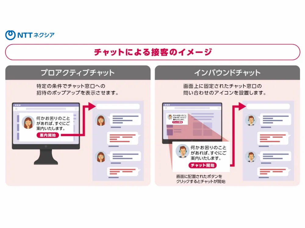 NTTネクシアでは長年のコンタクトセンター業務で培ったコミュニケーションスキルを生かし、企業さまに最適なチャット・チャットボットの選定や顧客接点全体の構築をお手伝いします。