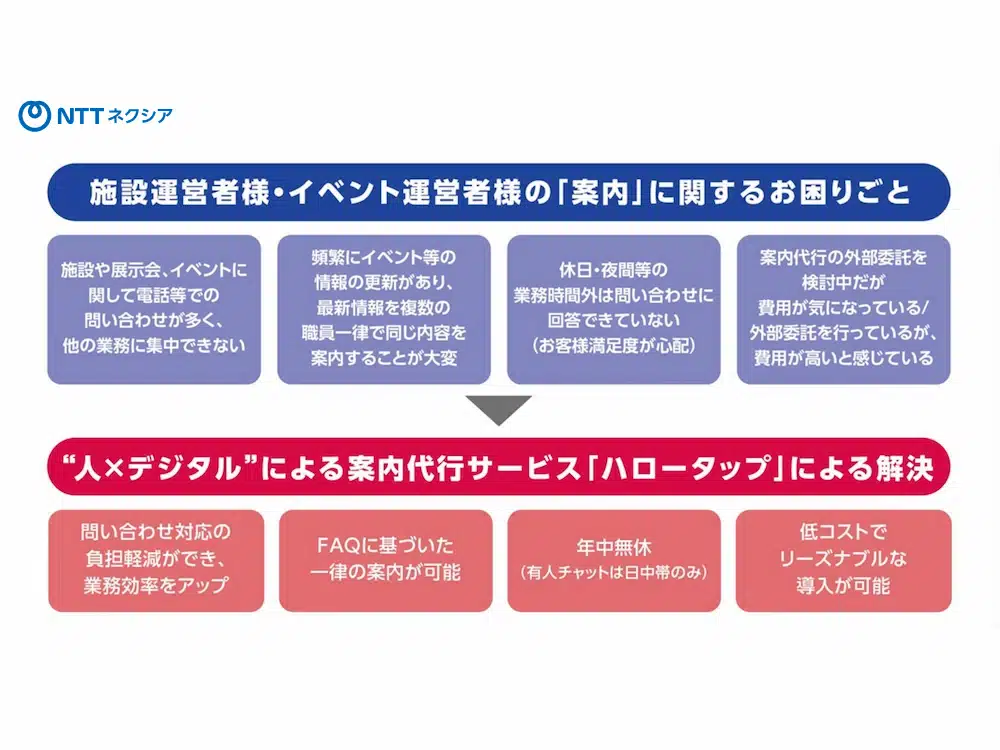 美術館や博物館等の施設運営者様や、イベント運営者様等の「案内」に関するお困りごとを、"人" と"デジタルツール"の活用により解決します。